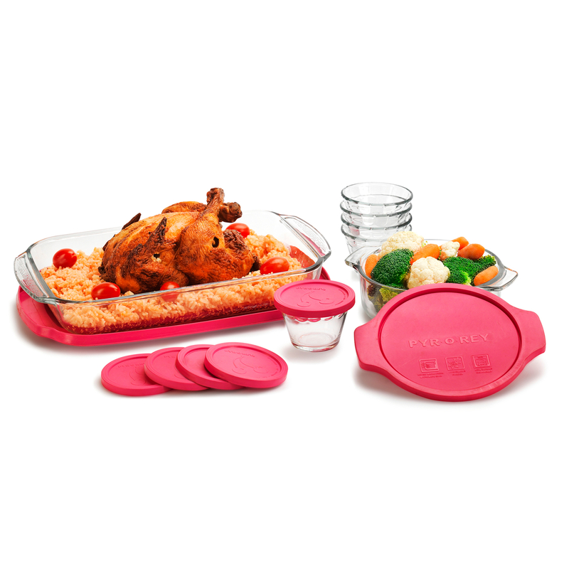 Contiene: 1 Bandeja Rectangular de 2.5 Lt 1 Cacerola multiusos de 984 ml 3 Flaneras de 175 ml 5 Tapas plasticas