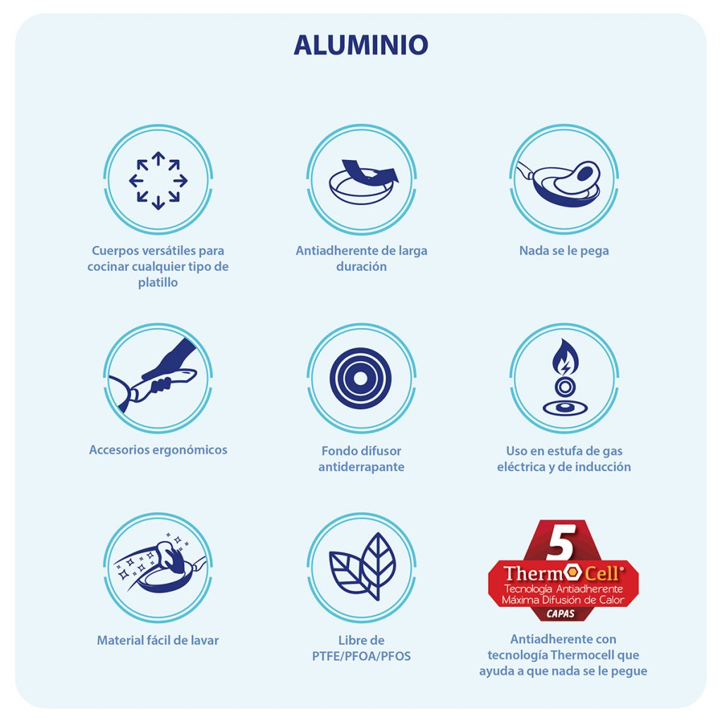 Medida / Capacidad Sartén 20 cm. 1.9 mm. Azul Summer Sartén 22 cm. 1.9 mm. Rosa Regalía Sartén 24 cm. 1.9 mm. Verde Spirit Sartén 26 cm. 1.9 mm. Morado Casiopea Espátula de Nylon Material Aluminio con Antiadherente Color Azul Summer La Tecnología Thermocell aplicada en la Línea de Aluminio además de contar con 5 capas de Antiadherente para que nada se le pegue, te brinda mejor distribución de calor de manera rápida y uniforme, los productos de Aluminio CINSA cuentan con accesorios ergonómicos que fácilitan el manejo al cocinar. |